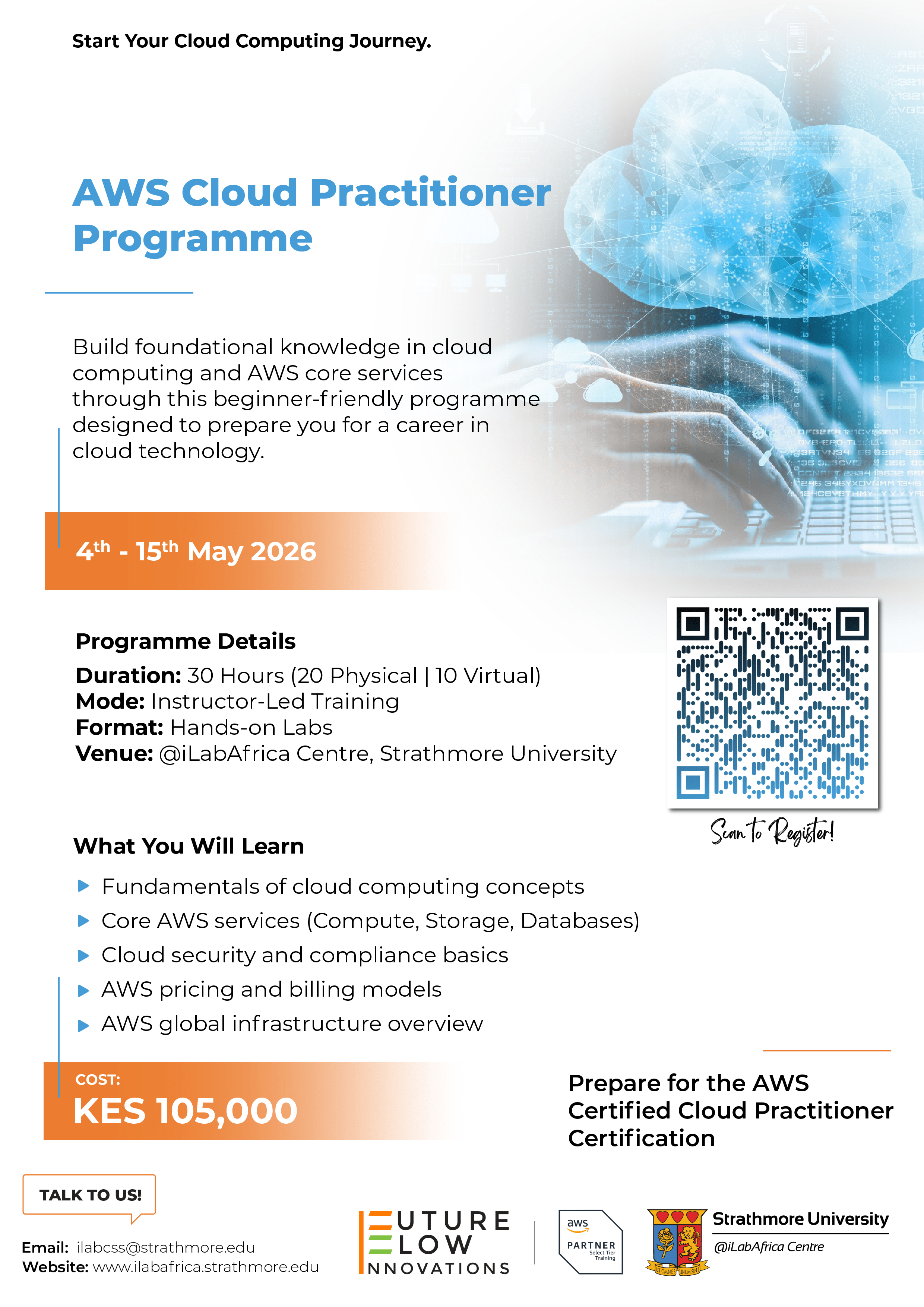 The programme builds foundational knowledge in cloud concepts, AWS services, security basics, pricing models, and cloud value in business. It prepares learners for the AWS Certified Cloud Practitioner certification and provides a starting point for careers in cloud computing.
