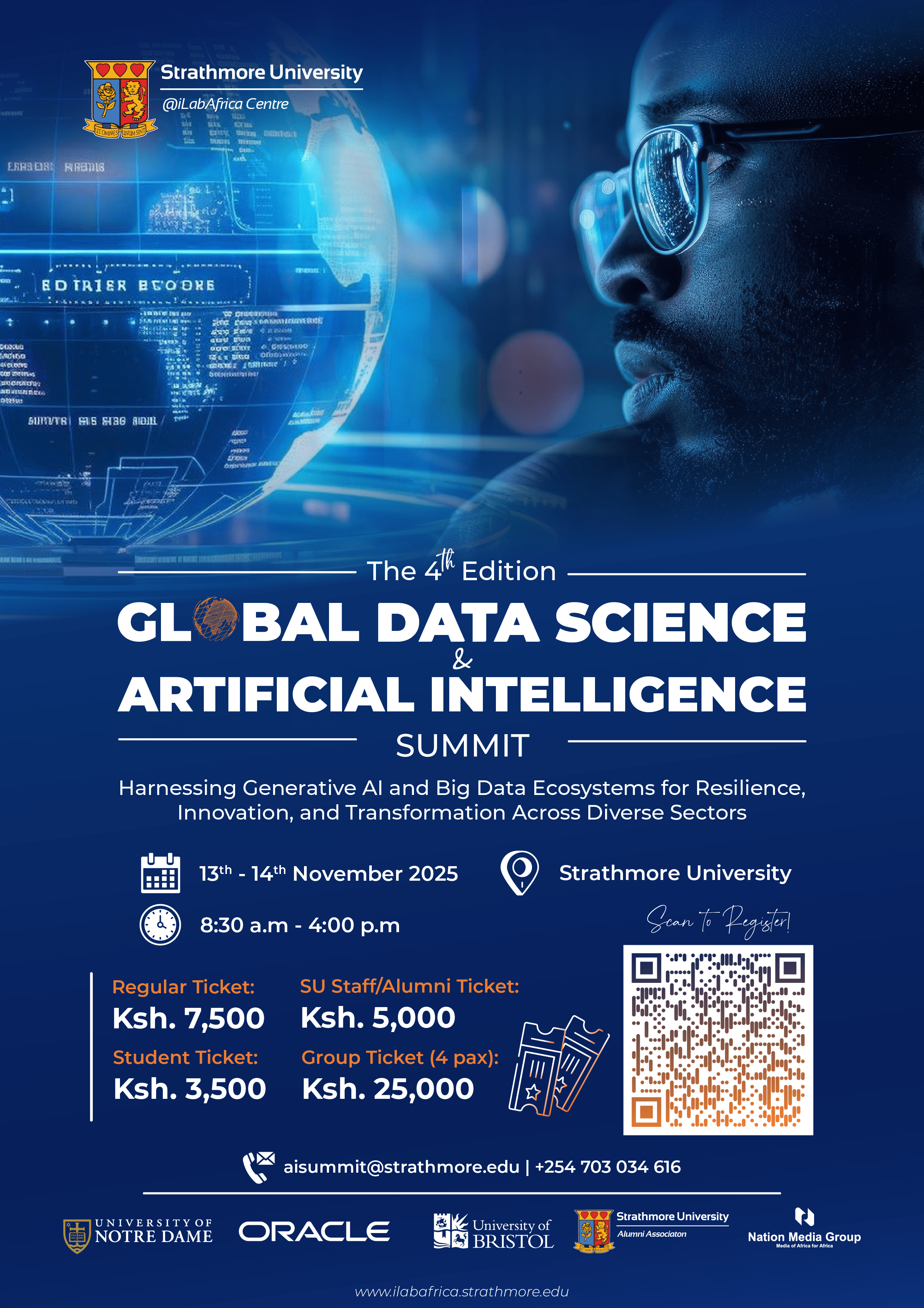 The Data Science Unit @iLabAfrica Research and Innovation Centre, in collaboration with Key Sponsors and Data Science-driven industry partners, will hold the 4th Global Data Science and Artificial Intelligence Summit (GDSAI) on the 13th – 14th November 2025 at Strathmore University.