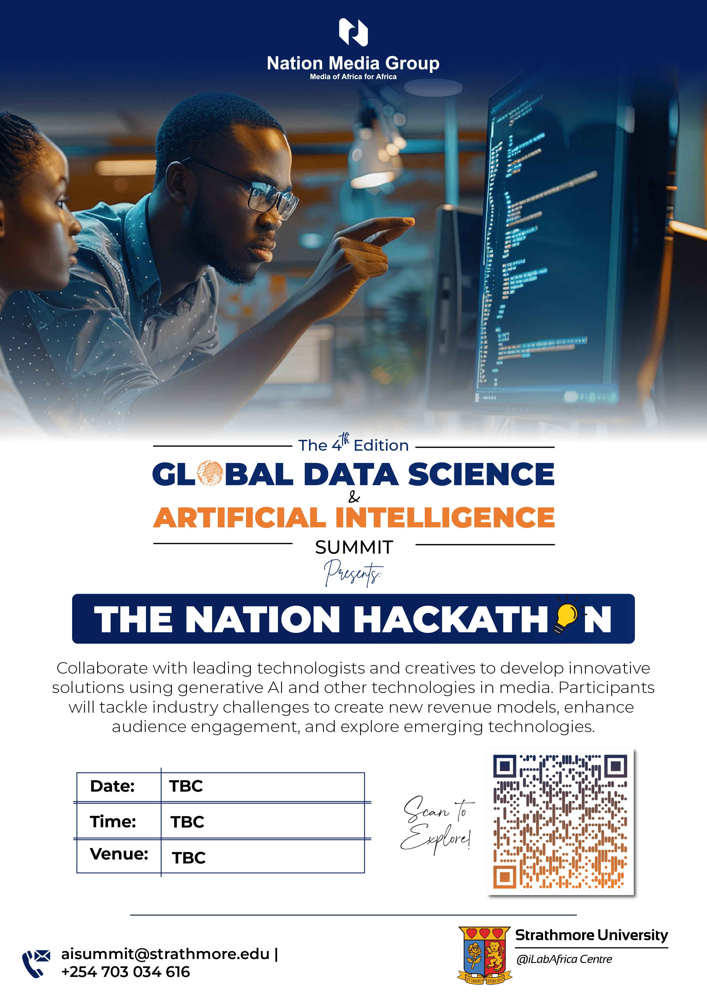 Nation Media Group (NMG), in collaboration with Strathmore University, presents The Nation Hackathon, a transformative event happening on three key days, the 10th – 12th of November 2025. This event will bring together teams made of top engineers, product developers, creatives, university students, and media enthusiasts to explore AI and emerging technologies that can shape the media landscape.